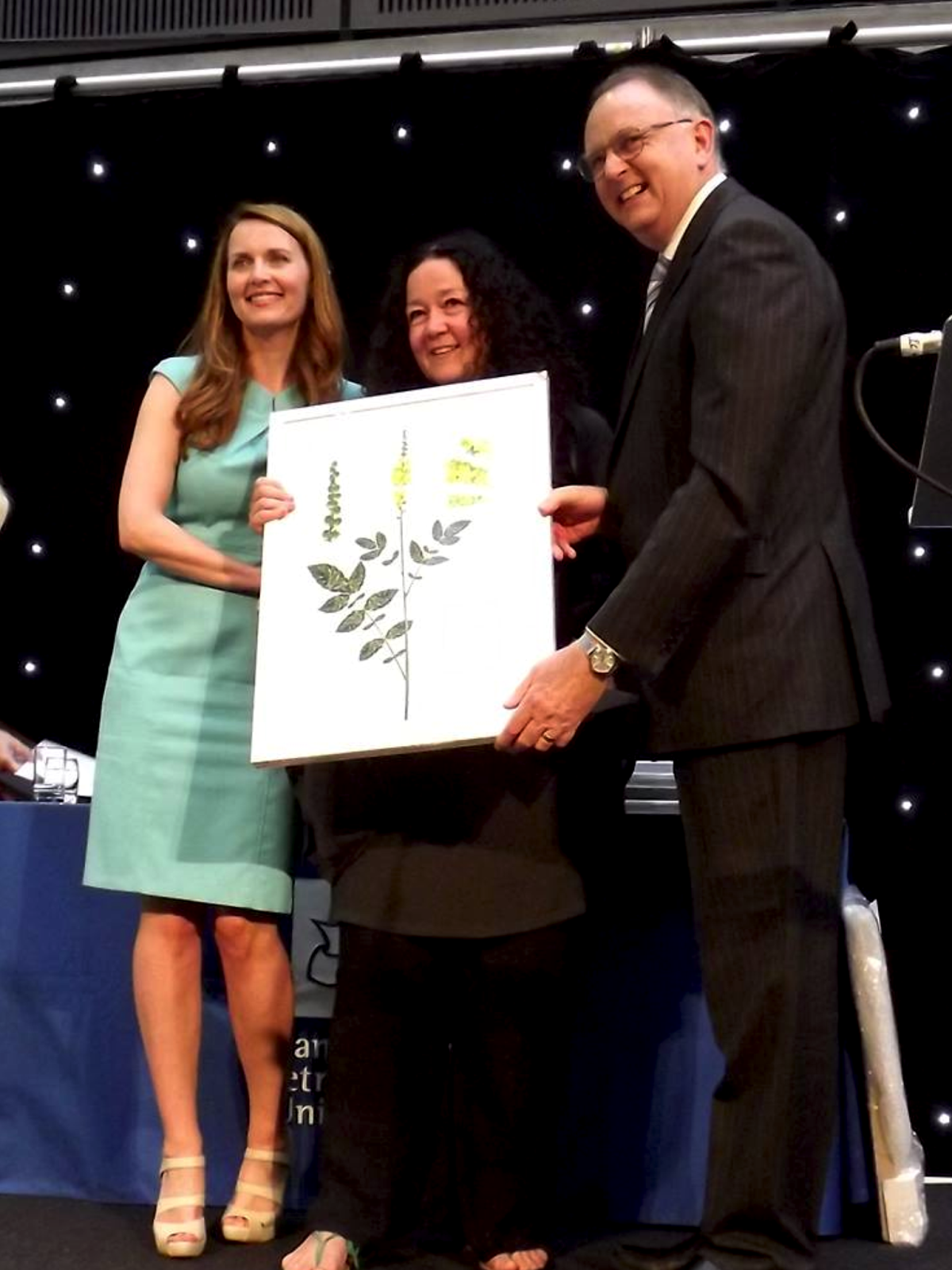 Debra Stephenson and Vice-Chancellor John Brooks present the Outstanding Contribution Award to Rebecca Lawthom. |