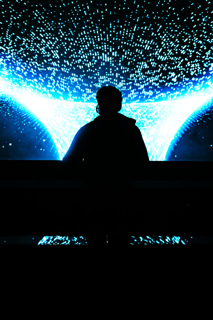 As the clock nears ten the words “Kaytranada, classic, timeless” echo and are met with thunderous cheers and a breathtaking display of pyrotechnics that reveal a silhouette of Kaytranada who is backlit by stunning visuals that show a blue mushroom cloud exploding into his name written in the stars.