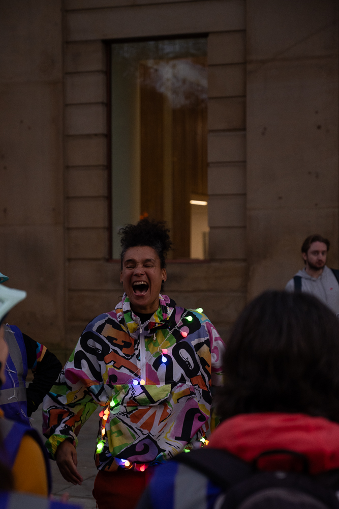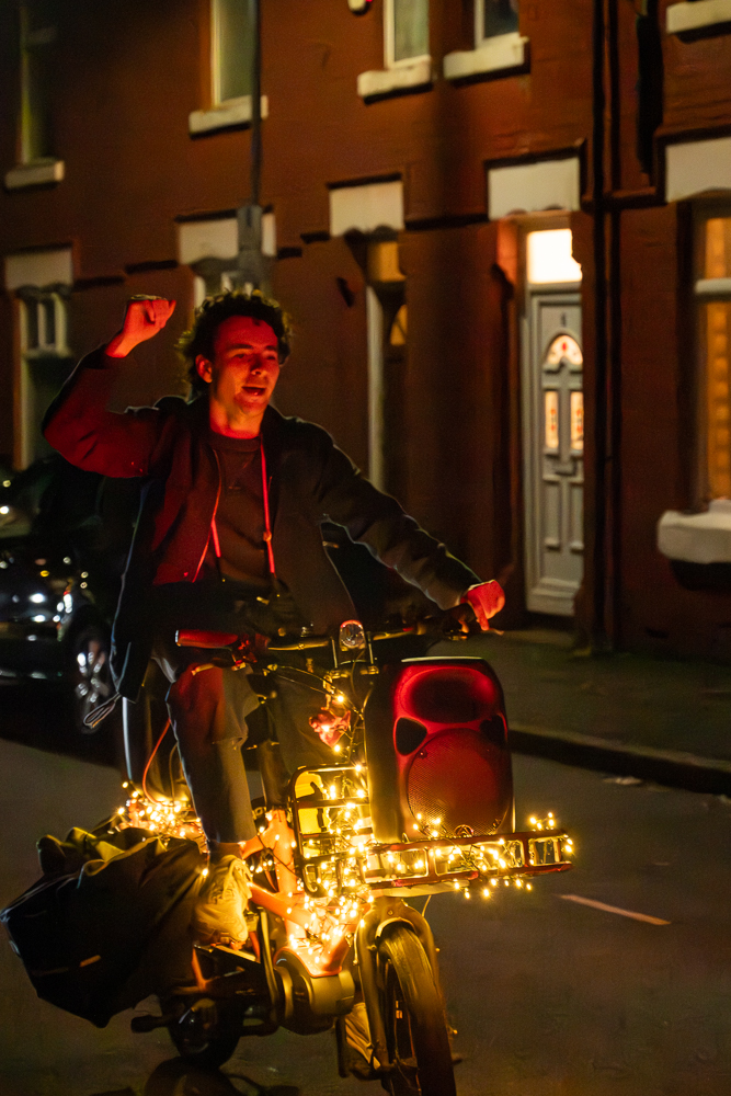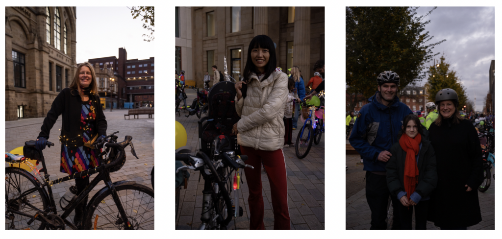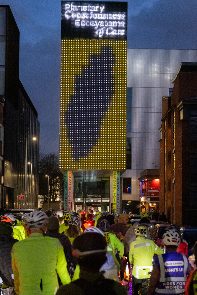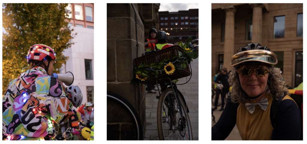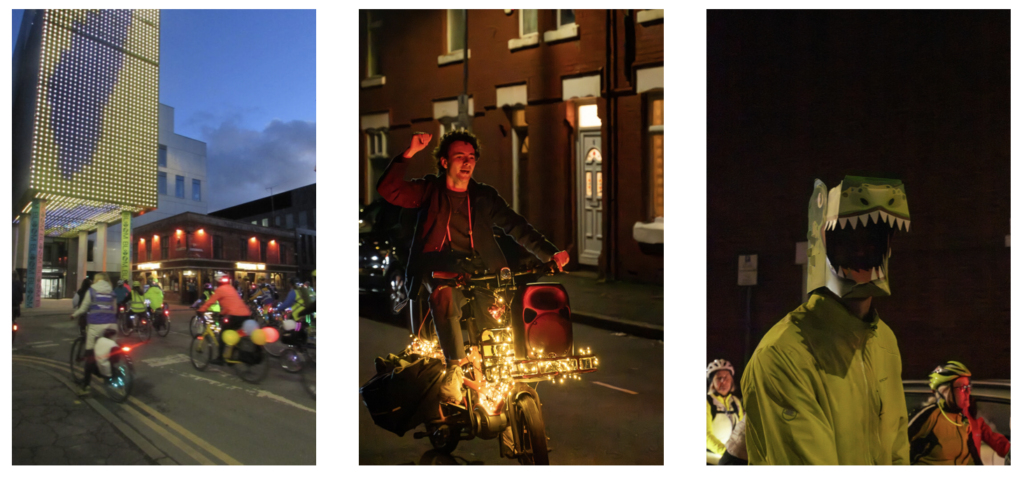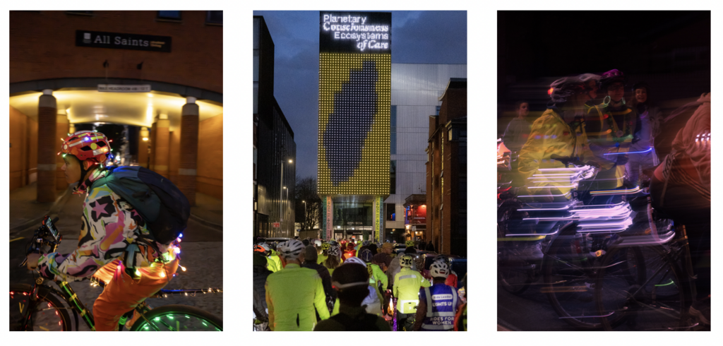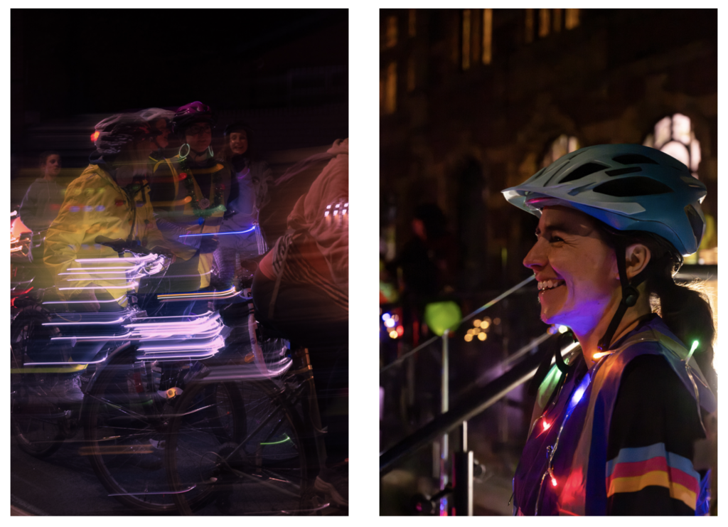 Riders gathered at All Saints Park on Oxford Road, sharing coffee and snacks before setting off after sunset towards Victoria Baths. Illuminated by fairy lights and reflective gear, the group cycled past the Manchester Met’s School of Digital Art and through several of Manchester’s parks and neighbourhoods to raise awareness of the challenges women face when cycling at night, including safety concerns and poor visibility.
