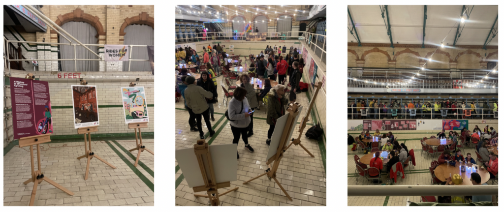 The aAh! X Lights Up exhibition showcased photography, illustration and graphic design centred on themes of women’s cycling, representation, safety and visibility, using the historic swimming baths as a dramatic backdrop for the colourful artwork.