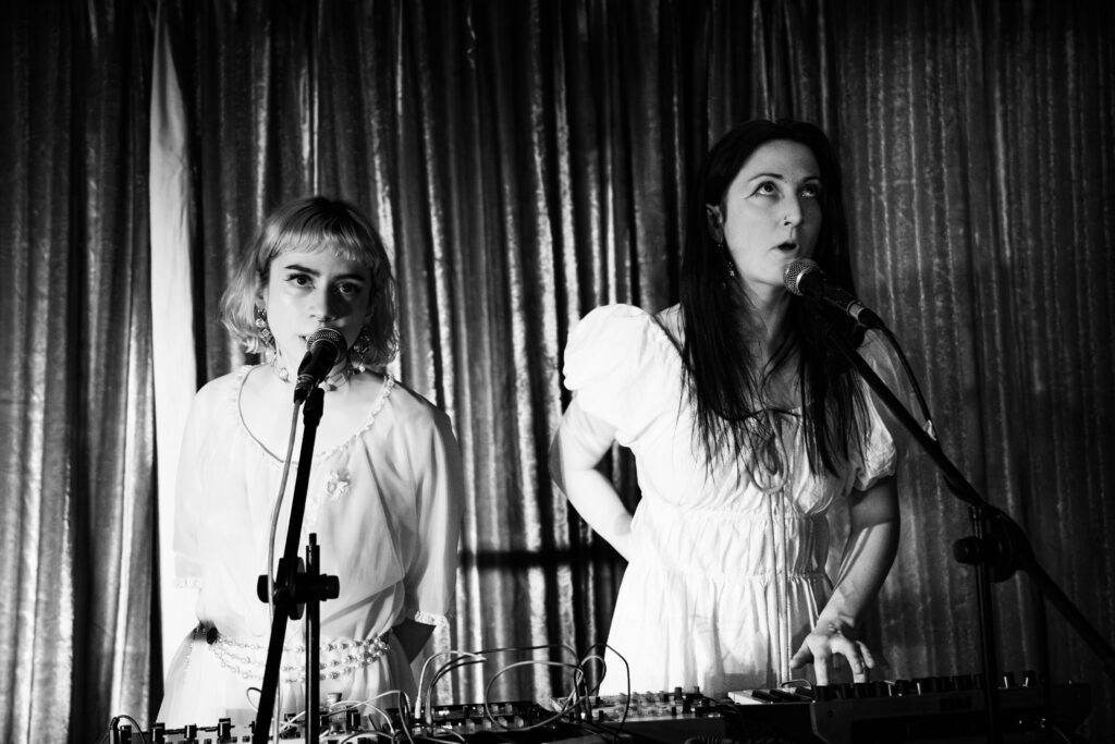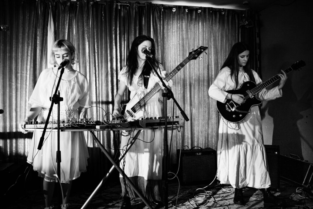 Opening the night is Manchester-based Leucotome, a witch-folk trio blending soft, raw vocals and a distinctive synth-driven electronic backing with a medieval undertone. Their setup is as unconventional as their sound, with an ironing board doubling as a table for their synth gear.