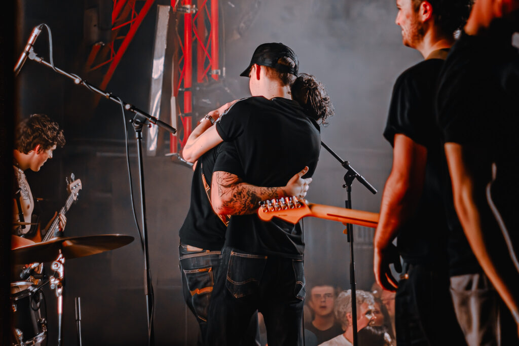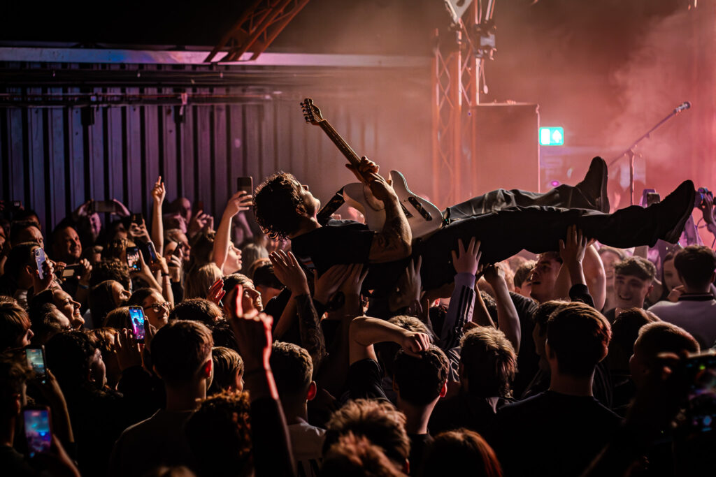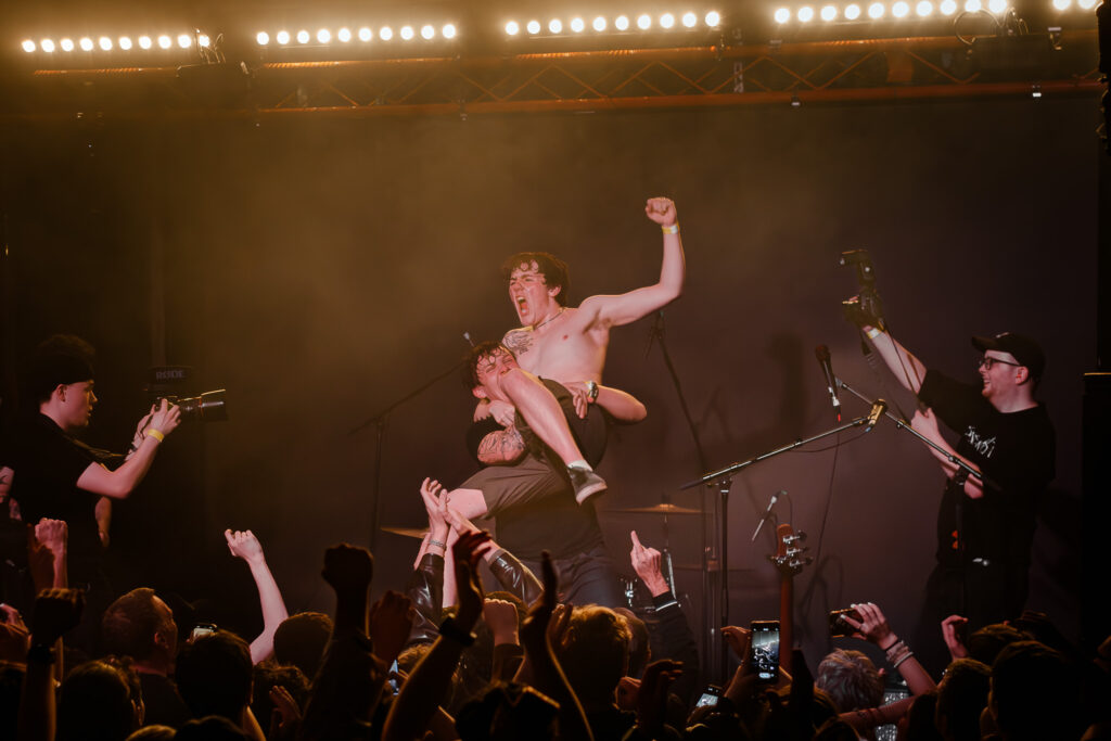 Taking a break from heavier riffs, we arrive at summer anthem ‘Calling Up’, almost certain to land well at their Tramlines and Truck Festival slots this year. One of the show’s standout moments comes as they pull a fan named Joe on stage, joining them on guitar, to an emphatic reception.